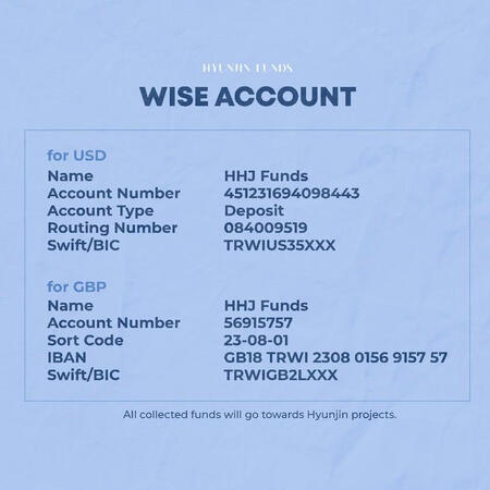 Hello! We are HHJFunds, a dedicated funding account for Hyunjin of Stray Kids. Our aim is to raise funds to support all of Hyunjin's future activities. This includes providing premium Spotify accounts, iTunes funds, funding birthday votings, organizing billboards, charitable initiatives in his name, and more.